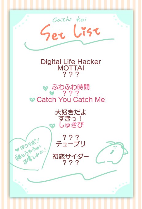 近々行われる予定のガチ恋ライブのセットリストを公開!ピンクの字のところはゲストと一緒に歌うよ😎