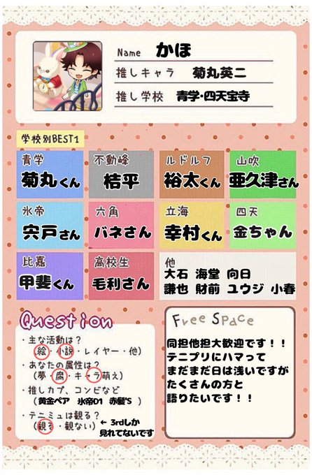 青学、四天宝寺箱推し、菊丸くん最推しです!! たま〜に絵を描き、ごくごく稀に文も書きます_✍ 同担さん他担さん大歓迎なのでゆるっと繋がれたら嬉しいです💕💕 ♡orRTでお迎えします🚗💨 ⚠️固ツイ確認お願いします🙇♂️ #日曜日突然のテニプリテニミュフォロー祭 #テニプリクラスタさんと繋がりたい