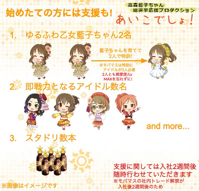 弊社では次回総選挙を共に頑張りたい社員を募集中です。始めたての方へ支援もあります!モバマスを始める/始めたての方、支援したい方ぜひご連絡下さい!#担当プロ宣伝190815 #高森藍子 #毎月15日は藍子の日 https://t.co/VXO24mefQe