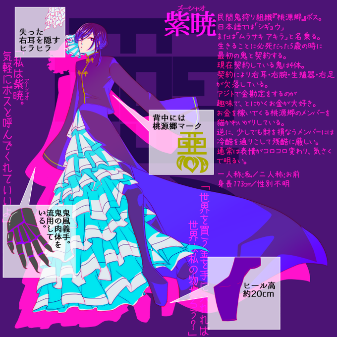 マリは白い髪、深紅の瞳を持ち、インバネスコートを着て髪をリボンで結った吸血鬼(純血種)です。優美な装飾が施された細剣が主武装です。始祖の1柱です。昔、人間を震え上がらせた強大な吸血鬼ですが、太陽がとりわけ苦手です。