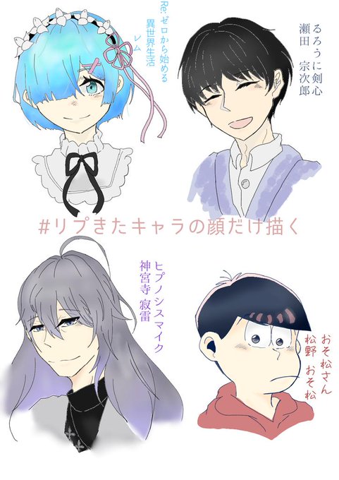 #リプきたキャラの顔だけ描く レムちゃん、宗次郎、寂雷先生、おそ兄描かせて貰いました!楽しかったです🙏💕