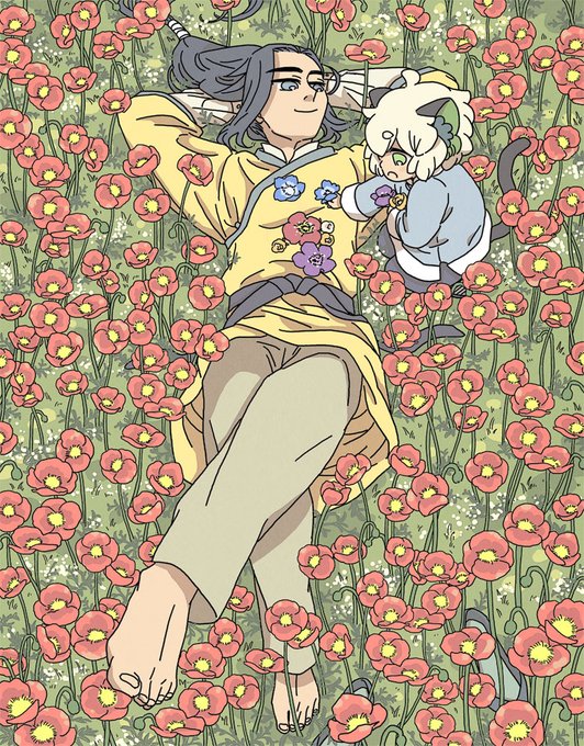 これまでのお花絵、ブーゲンビリア、ポピー、金木犀、朝顔。猫ちゃん率高いわね🐈⬛🐈⬛