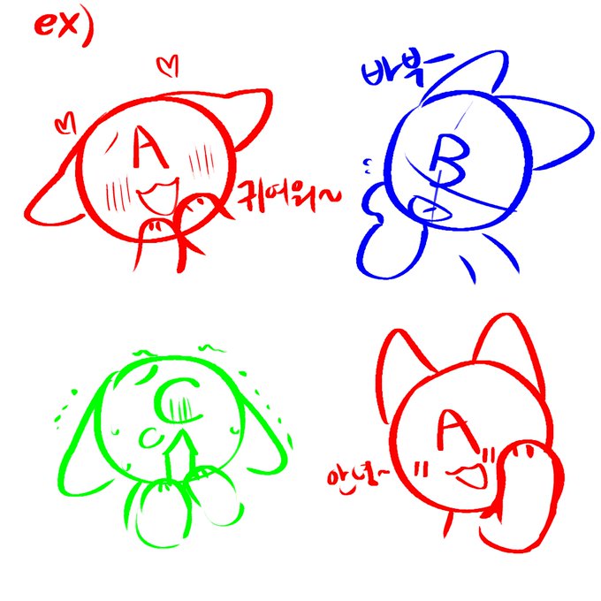 가격은 1.5이며, 감정표현은 4가지 가능합니다! 예시 그림처럼 4가지 감정표현마다 각각 다른 캐릭터를 넣을 수도 있어요! 감정표현은 직접 골라서 알려주셔도 되고 오마카세도 가능합니다! 퀄리티는 단채색에 하이라이트를 추가한 정도이며 흉상정도만 나옵니다! 입금온리!