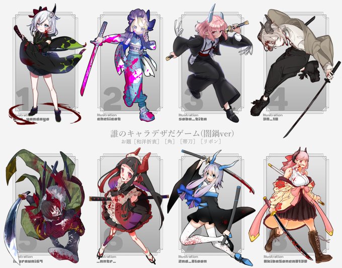 #誰のキャラデザだゲーム [和洋折衷][角][帯刀][リボン] 総勢8名のデザインを混ぜてそれぞれが清書する企画に参加させてもらいました! 自分は6番の子を担当してます🗡  この中でなまたろがデザインした子は誰でしょうか! リプにてアンケート付けますのでよければ予想してみてください🦦