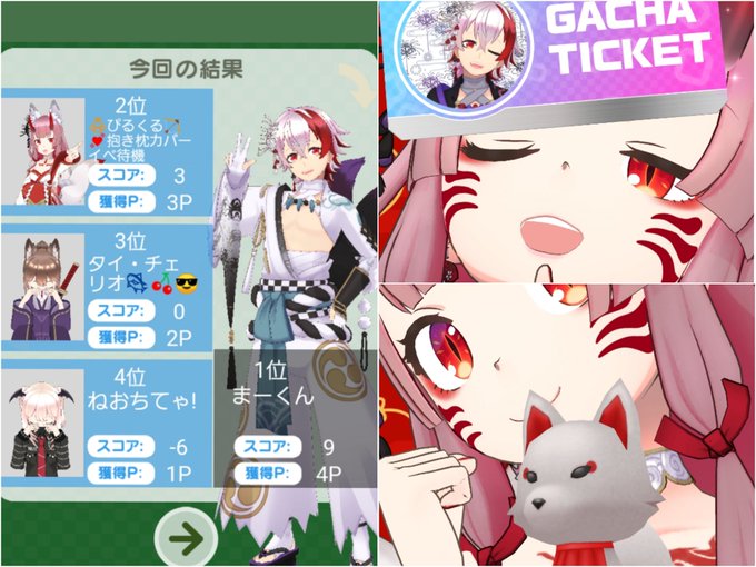 朝枠🥺 シロ❤なすびちゃ❤あまね❤あさぎはん❤🎫ありがとう!しかしお目当てのモノを引く事ができず…🥺引き悪すぎて本当ごめん!本当にありがとう!まだ頑張ります!! そして⛩🦊のシロが沢山可愛くしてくれたのでパチッと📸!ありがとう💗 #REALITY #リアリティ #ぴるっとぴるくる #Vtuber