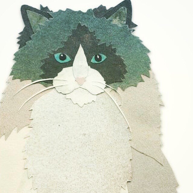 This grumpy Tom cat was cut and created entirely from pages of old children’s books. He now features on a birthday card and a ‘bag humbug’ Christmas card!