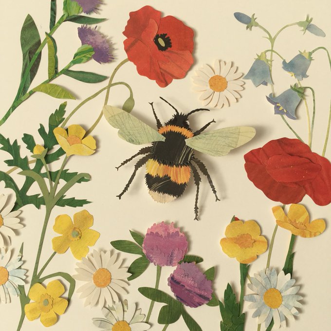 Today is #NationalMeadowsDay so the perfect excuse to post my favourite artwork..’Bumble Bee in meadow flowers’ will be in the ‘British Wildlife Open’ exhibition at @ACEartsSomerset in October. Cut & created from the pages of old children’s books. #artistsontwitter #bumblebee