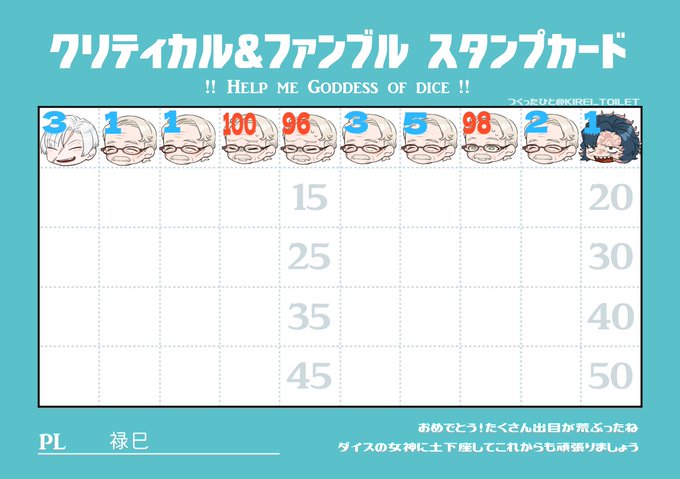 @TRPG_TL CoC『キウミノラクゴ』 おひさしゅうまに5メン!やるぞやるぞ~~~!どんどこ探索するぞ! 今日の七竃は初期値を2回も通した えらいぞ 100は出た