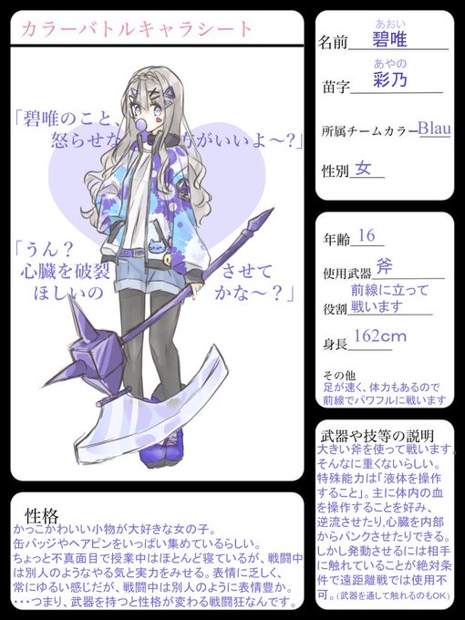 #創作カラーバトル企画 超絶大遅刻です。。。申し訳ない( ;∀;) Blauチームの彩乃碧唯(アヤノアオイ)ちゃんです!よろしくお願いします(*'▽')