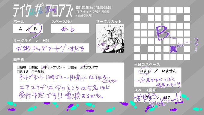 フロアズWebオンリー(@TakeTheFloors) B-か6 で参加いたします!ねっぷりとエアスケブのみとなりますがよろしくお願いいたします!詳細は添付画像を確認いただければと思います:) #TaketheFlaz