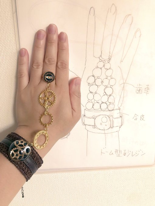 kisatoさんのデザイン画と実際に作った物など。 パンジャは原形行方不明な仕上がりに(笑)(デザフェスで販売するのは写真2枚目) 眼鏡チェーンは創作物語「輪廻廻廊」の登場人物「師匠」の絵を元に。歯車をひたすら繋いだチェーン。