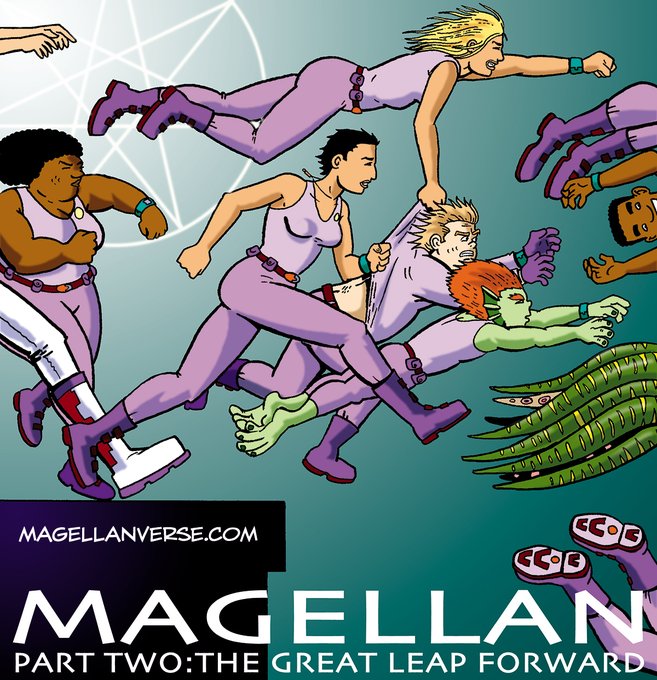 Today is the 16th birthday of my webcomic Magellan. Yes, 16 years - some have been more productive than others but it amounts to over 1000 pages of superheroics, sci-fi & fantasy and crossovers. Here's some cover art to celebrate! https://t.co/Q8zKiD7UN1