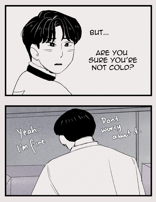 "...and it's not because of the cold. No, he's burning up because his crush is wearing his jacket, and not just any old jacket, the one that has Park Sungjin embroidered on the chest."