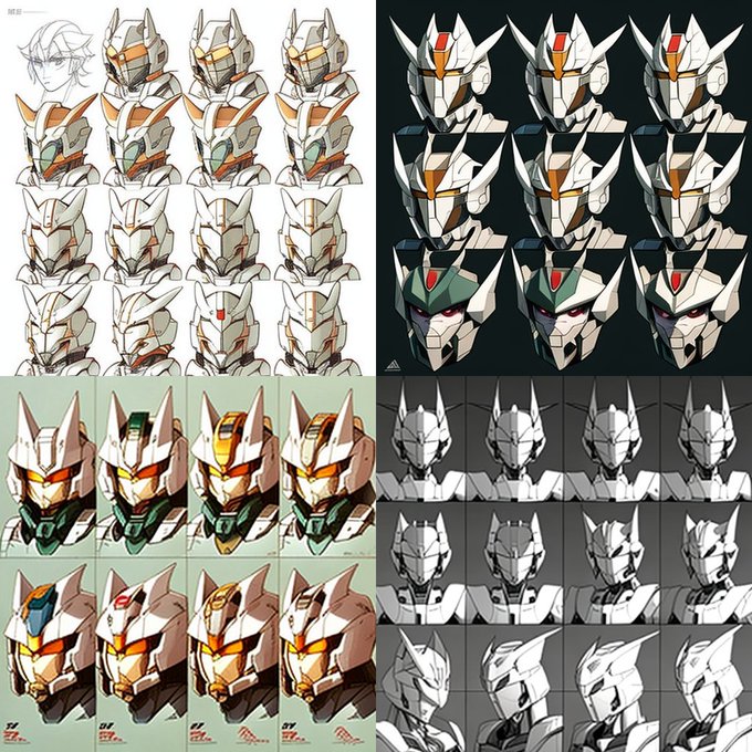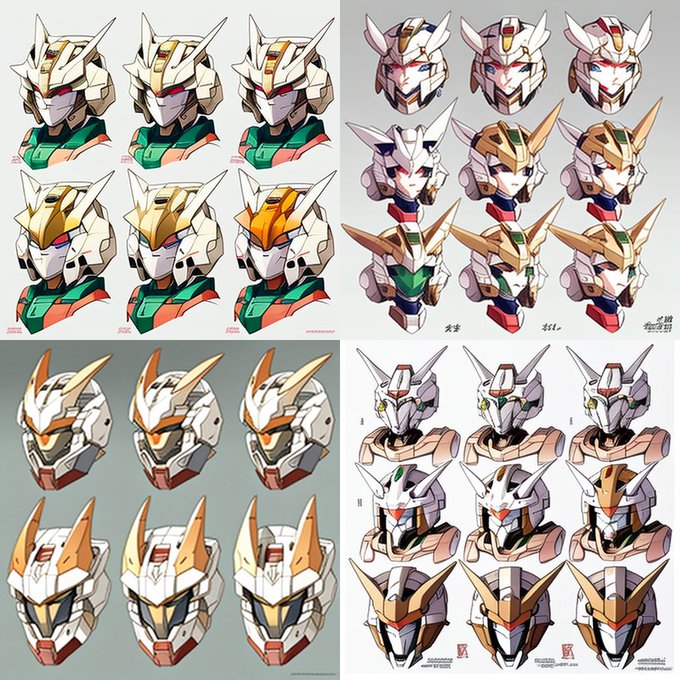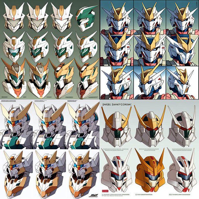 参考までにMidjourney V4 で、 Collection sheet of Gundam face variations.