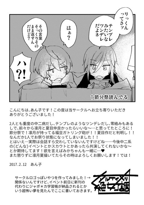 昨日の無配の凛月夏だったものです!早々になくなってしまって十分な用意ができず申し訳ありませんでした💦そして字とか潰れて見づらかったらすみません💦