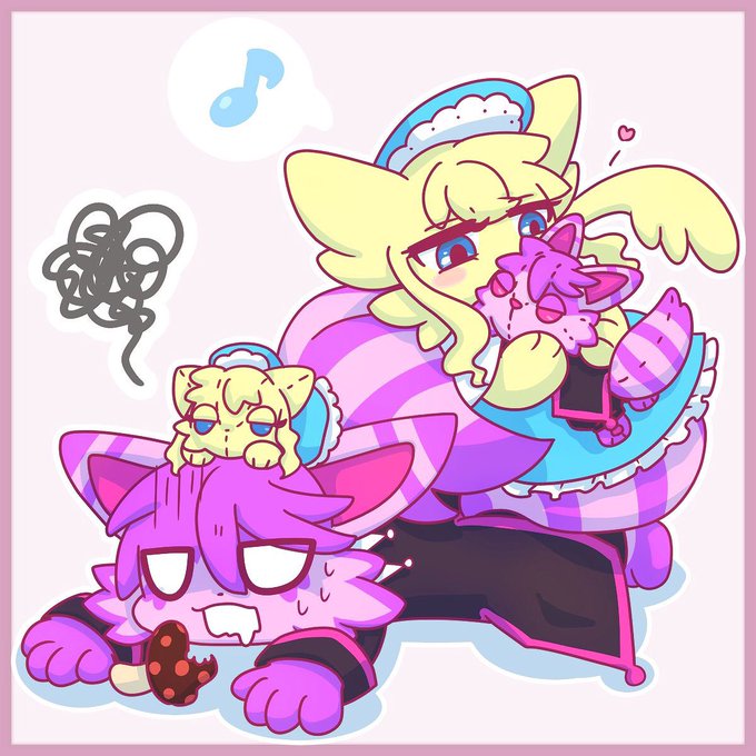 しっぽとチェシカくんぬいぐるみに挟まれてご満悦なアリスちゃん(と犠牲になったチェシカくん) #魔けモンFA
