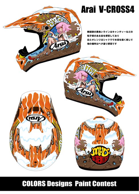 二枚目! エンデューロで泥ハネがついちゃうのがむしろ楽しいヘルメットを!というコンセプトでデザインしました 側面の凸凹少ないから絵を中心にしたデザインでやるならAraiさんの方が良いかも! #colorsペイントコンテスト