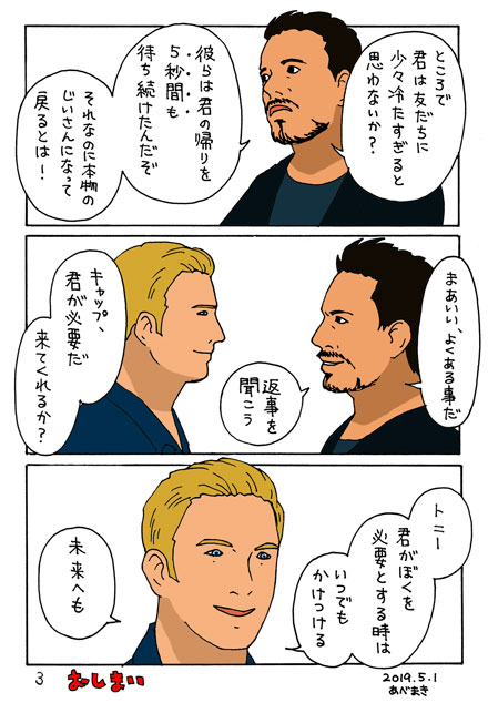 「アベンジャーズ エンドゲーム」の感想・要望漫画再ツイートです。 自分の気持ちの整理の為に描きました。 公式でIWのロキに帰ってきて欲しいです! わたしのユニバースでは帰ったことになってます🐍 #MCU #マーベル #エンドゲーム #キャプテンアメリカ #アイアンマン