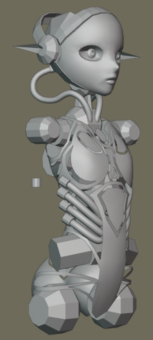 ほとんど変化ないけど一応足が少し進んだ。細かいパーツはスカルプトするかどうか迷いながらもポリゴンモデリングで済ませようとしてしまっている……全体を見渡した時、胴体との印象が大きく変わってしまうのであまり好ましくないのだが、しかしここはかっちりした線の方が映えるよな、とも……