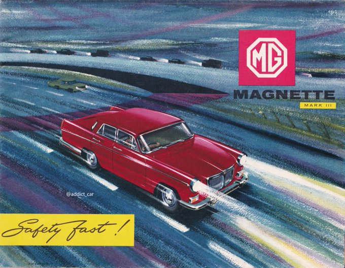 MG's 1960 brochure on the Farina-styled Magnette MkIII pulled out all the stops to emphasise the new model's 'dynamic sports car performance', although the text failed to put a figure on the 'ample' power output of the BMC B-series 1489cc twin carb engine. #carbrochure #MG