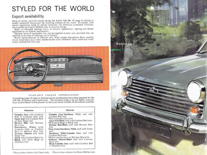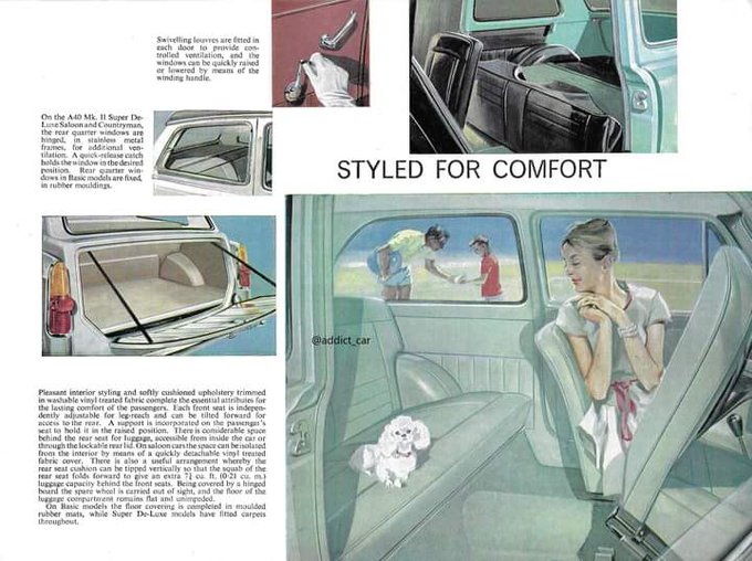 The Farina-styled Austin A40, although rear-wheel-drive, has a good claim to be one of the ancestors of the modern small hatchback in its Countryman version, with split tailgate and folding rear seat. This 1100 cc mkII was launched in late 1962. #carbrochure #Austin