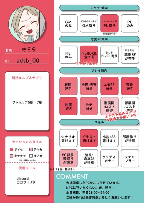 #TRPG自己紹介シート #TRPG好きと繋がりたい フォロワーがやってるからやろ〜🎶という軽い気持ちです。 全員お迎えは出来ないかと思われますが、ぼちぼち♻️♥️巡回する予定です。