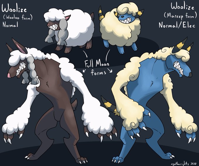 i know everyone and their mom did a wolf-in-sheep's-clothing styled #fakemon already but since my #fanregion has moon phase mechanics I opted to lean hard into it and make Woolize (Wool + lies/Wool over my eyes) just a full on werewolf sheep mimic.