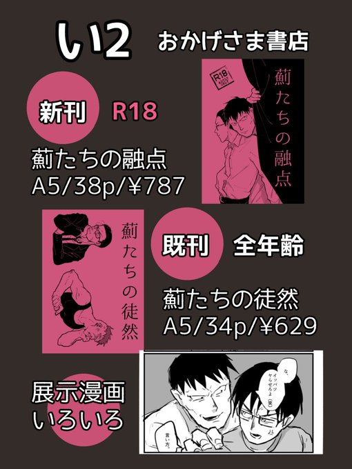#常闇切り裂く拳と刃 明日の昼から開催だそうです🙌✨ 突貫のおしながきとサークルカットだよ! 展示漫画もいくつか用意してるので、よければ遊びにきてください よろしくお願いします🏔🌸