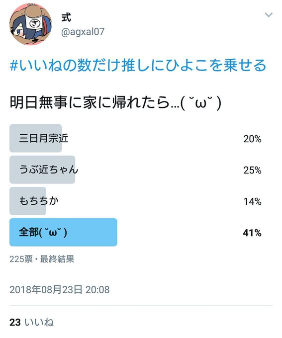 #いいねの数だけ推しにひよこを乗せる 23いいねありがとう御座いました!! あとおまけのアンケートご協力いただいた数225ひよこバージョン。