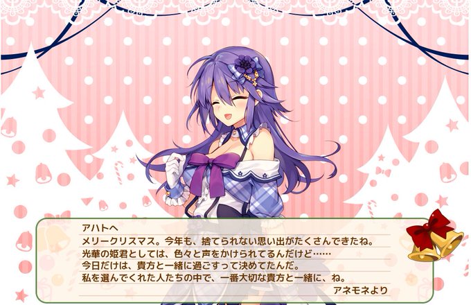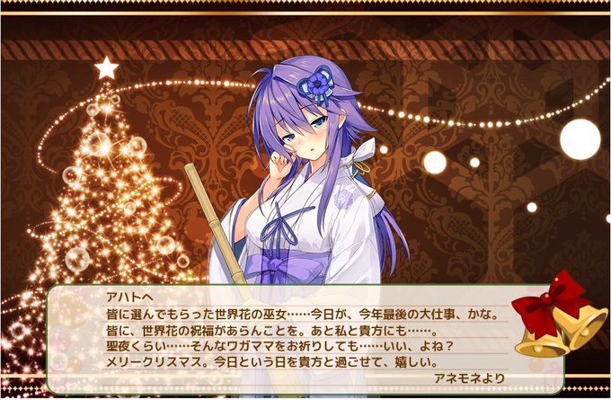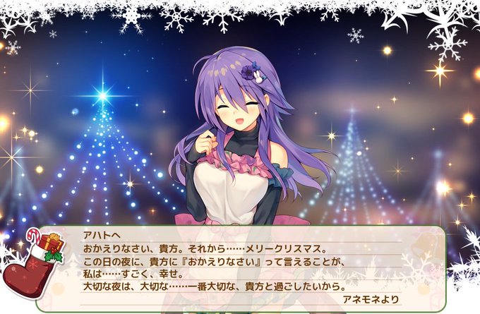 キャラのスキンによってセリフも違ったりクリスマスカードの 背景も違うんだね アネモネの中で好きなセリフは全部と言いたいけど 新妻スキンのセリフがいいかな~ #花騎士 #フラワーナイトガール