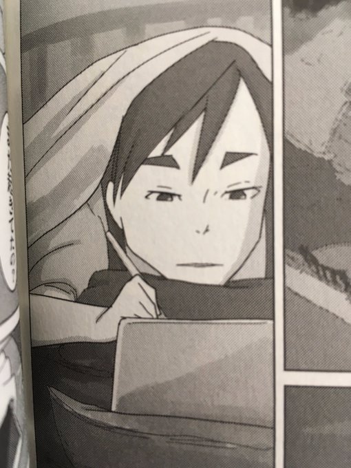 水崎氏が布団に潜りながら描くシーンが好きです。僕も小学生の頃から勉強や絵などをする時は寝転がりながらするもので。まぁ水崎氏は両親の眼を盗んで描く状況だから布団で描くことになったのですけど。 #映像研