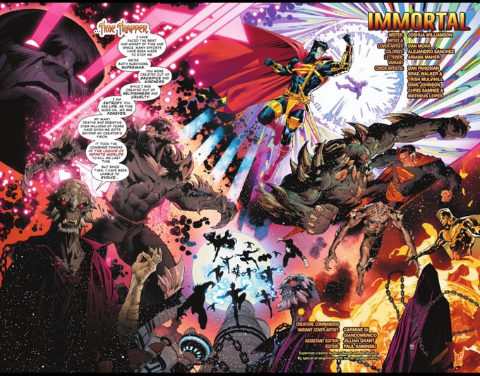 スーパーマン#20、前号が状況説明と導入という感じだったので、2話目は派手なバトル! サンプルの範囲なので見開きで貼っちゃうけど、この未来のドゥームズデイ=タイムトラッパーが語るスーパーマンとの戦いの歴史のスケールが堪らん。