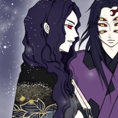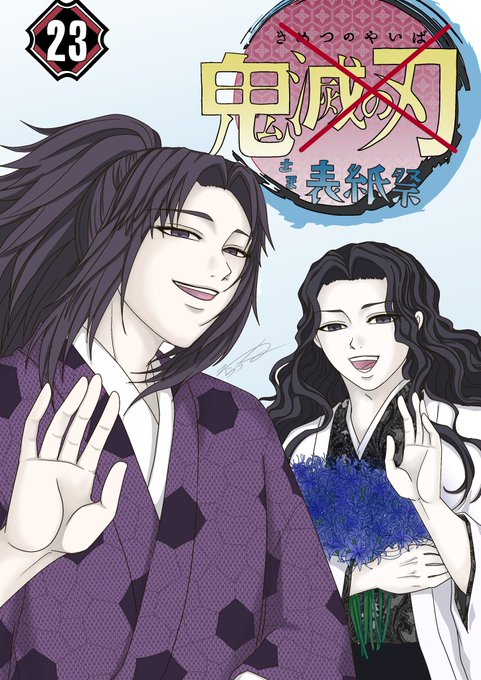 #鬼さん表紙祭 @oni1draw1write 最終巻、こうだったと思う(強めの幻覚) 太陽克服したむざ様と痣の呪縛から解放されたしぼ殿 いましたよね???(かなり強めの幻覚)