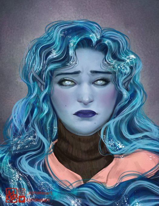 Omen (they, water genasi hexblade lock pirate w/ cursed animated migrating tats)!