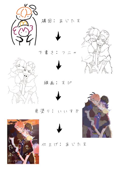 表紙の分担です。構図がこれなのに下書きで超進化しててすごいなっておもいました。