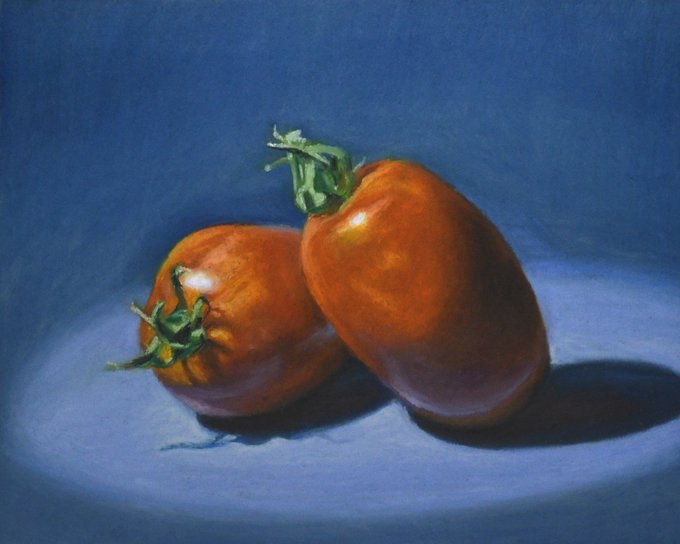 短時間で描いたトマト。 1枚目、油彩。 2枚目、水彩。 3枚目、アクリル。 4枚目、オイルパステル。
