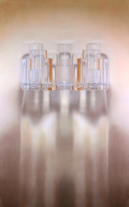 布の上にグラスをセッティングし、配置を記録して片付けて別の空間に同じ配置でセッティングして、それぞれを観察しながら描いた。