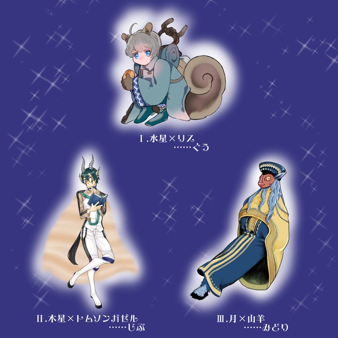 焙子さん主催の天体×獣要素誰デザ企画に参加させていただきました~! リプライにアンケート繋げてあるので良かったら投票お願いします! 私は月×山羊を描かせていただきました🌕🐐