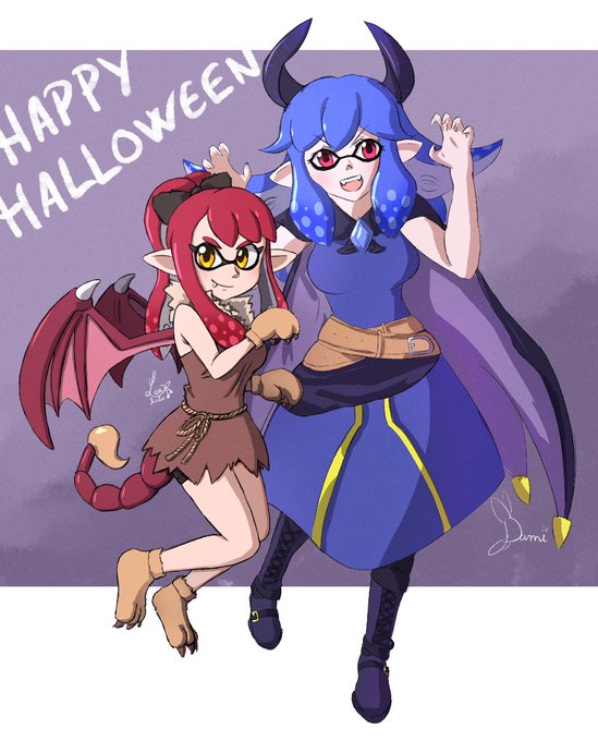 Collab avec @Damirtille pour Halloween ! Nous avons dessiné nos Inklings pour l'occasion. À gauche, Lau déguisée en manticore (par moi) et à droite, Dami déguisée en dragon (par Dami). Graou !!