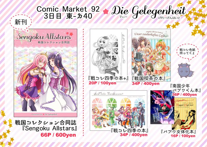 夏コミ(C92)最後の告知です。戦国コレクション合同誌「Sengoku Allstars」を配布します!戦コレファンの皆様を「東カ40a/Die Gelegenheit 」にてお待ちしております。詳細→https://t.co/SQm8cPjCV7 その他配布物はお品書き参照☆