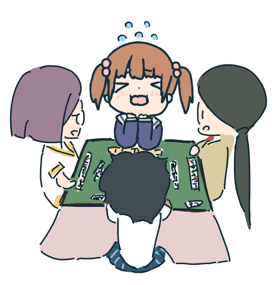 @mkmk087 さんのヒナちゃんがとても可愛らしかったので麻雀をさせてカズミとエイとジェダの3人から直撃を食らう絵を描きました。