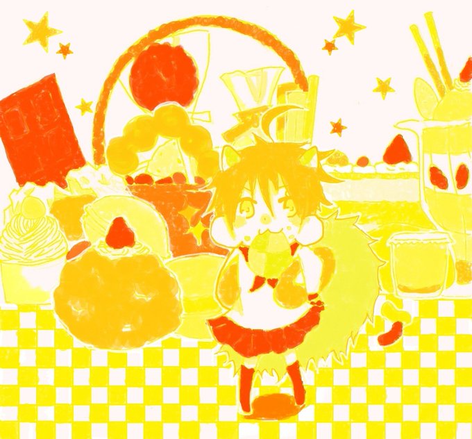 #ドーナッツどーんしてる絵が描きたい ↓この絵みたいな感じで描きたいけど、キャラが決まらないのでお題をください!先着2名で来なければ消します!