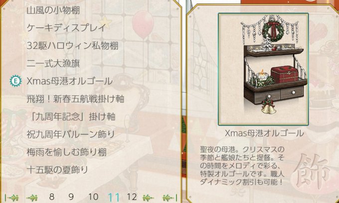 母港で艦娘とダンスしたい。 そんなあなたにこの家具! クリックするとあら不思議。流れ出る曲を聞きながら目を瞑って想像してみましょう。 ほら、手と手を取り合ってダンスしている気持ちになってくるでしょう。 私はヴィクトリアスとダンス中なので、ではまた。