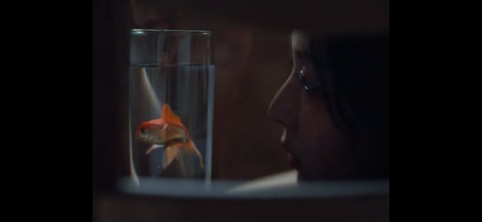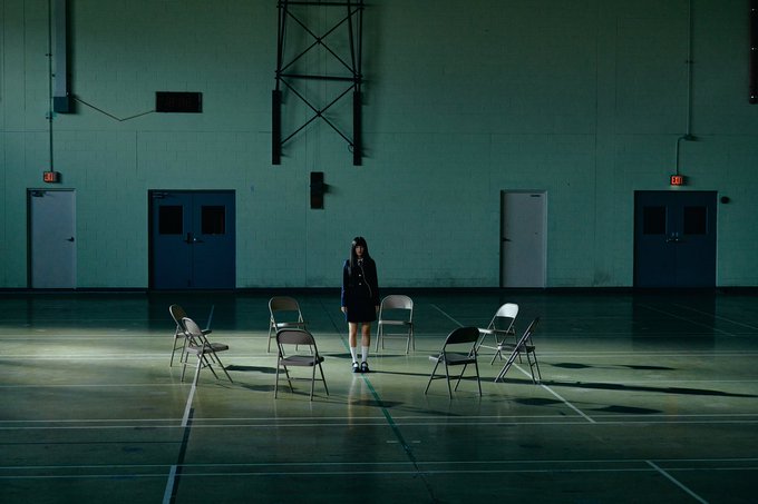 컵에 담긴 금붕어-쇠창살 같은 나무 기둥들-빙 둘러싼 빈 의자들과 양 쪽 문 위에 보이는 비상탈출구등-비상탈출구등과 cctv 슬기가 갇혀있음을 상징하는 모든 것들과 해방이 임박함을 알리는 신호들
