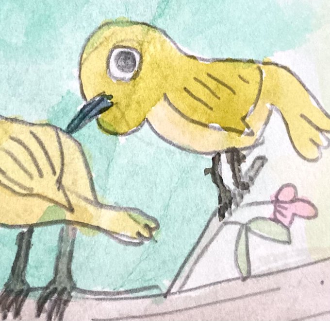 小5の時にかいた目がいっちゃってる鳥と部活で点描した時にかいたカワセミ