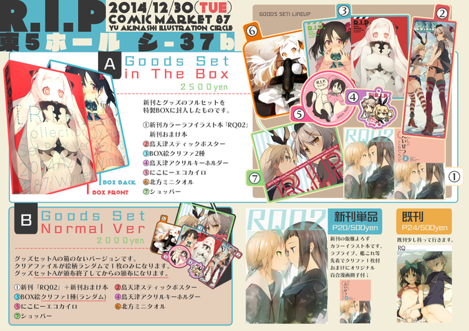 参加日は明後日ですが明日も忙しいので最後にもう一回お知らせと追記です!当日様子を見て決めますがグッズセットは1~3限から、本は5限から開始目安ですー。おしながき→http://t.co/GhDaG77ZeS