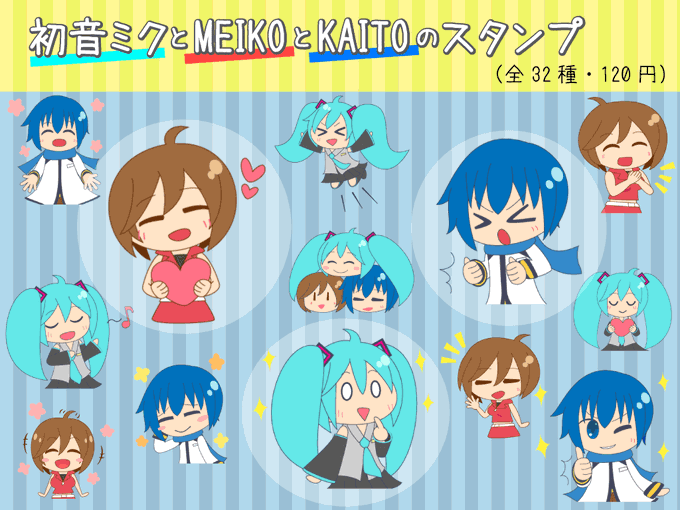 初音ミクとMEIKOとKAITOのスタンプ販売中!!!笑顔多めのスタンプとなっております!ミク、メイコ、カイトへの愛を込めて作りました!ボカロ好きの方よかったら使ってください!よろしくお願いします!!!https://t.co/h9pOSIxOnU … … #LINEスタンプ #初音ミク #MEIKO #KAITO #VOCALOID #ボカロ