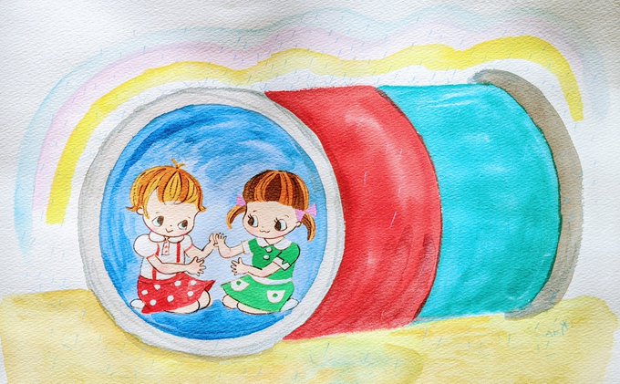 内緒の話は、公園のドカンの中だよ。 #昭和レトロ #子供 #どかん #公園 #絵本 #あきのもみじ