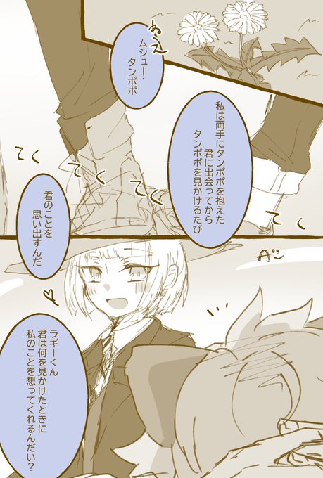 お題「タンポポ」 🏹「私はどんな時思われてるかな」 🍩「いつだってアンタのこと想ってるッスよ♡キャッ」ってラブラブ漫画です 描いてる途中今回はいけるぞ!って思いながら30分オーバーしました🤦 #ルクラギ版1D1W IDの書き忘れのため一度消し上げなおしました、失礼いたしました😨💦