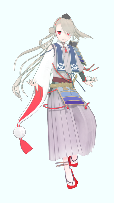お久しぶりです. できた!と思ったのですがToon設定を忘れていました.あと袴の演算が気持ち悪いです. 動画作ったら2衣装とも配布します.うまくいけば明日ですかね? #刀剣MMDモデル選手権
